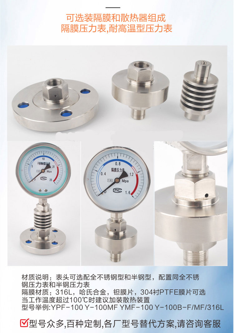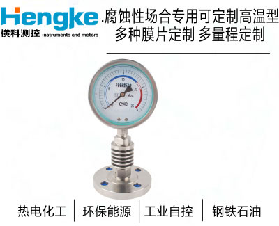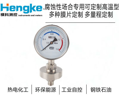 隔膜壓力表適用于測量強腐蝕、高溫、高粘度、易結晶、易凝固、有固體浮游物的介質壓力以及必須避免測量介質直接進入通用型壓力儀表和防止沉淀物積聚且易清洗的場合。