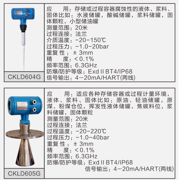 CKLD系列低頻雷達傳感器是科學的雷達式液位/物位/料位測量儀表,測量距離最大20米,可以用于存儲罐、中間緩沖罐或過程容器以及各種料倉的物位測量,輸出4…20mA模擬信號 。
